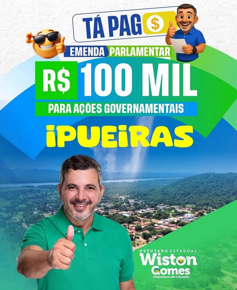 O Presidente da Câmara Municipal de Ipueiras, Vereador Jucelio de Durval Estevem em Palmas Juntamente com o Presidente da Colônia de Pescadores Agua Verde o Sr. Joelson Costa, momento em que solicitaram uma emenda parlamentar ao Deputado Estadual Winston Gomes, o mesmo atendeu prontamente e a Verba já está na conta da Prefeitura de Ipueiras.