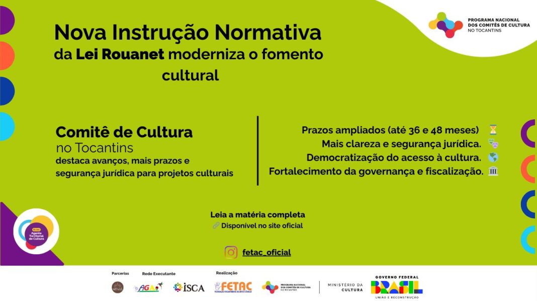 O Comitê de Cultura no Tocantins acompanha e celebra a publicação da nova Instrução Normativa nº 29 da Lei Rouanet, divulgada pelo Ministério da Cultura, na sexta-feira, 30. A atualização do principal mecanismo de incentivo à cultura do país representa um marco importante para a gestão, execução e fiscalização de projetos culturais, trazendo mais clareza normativa, ampliação de prazos e ajustes alinhados às demandas históricas do setor.