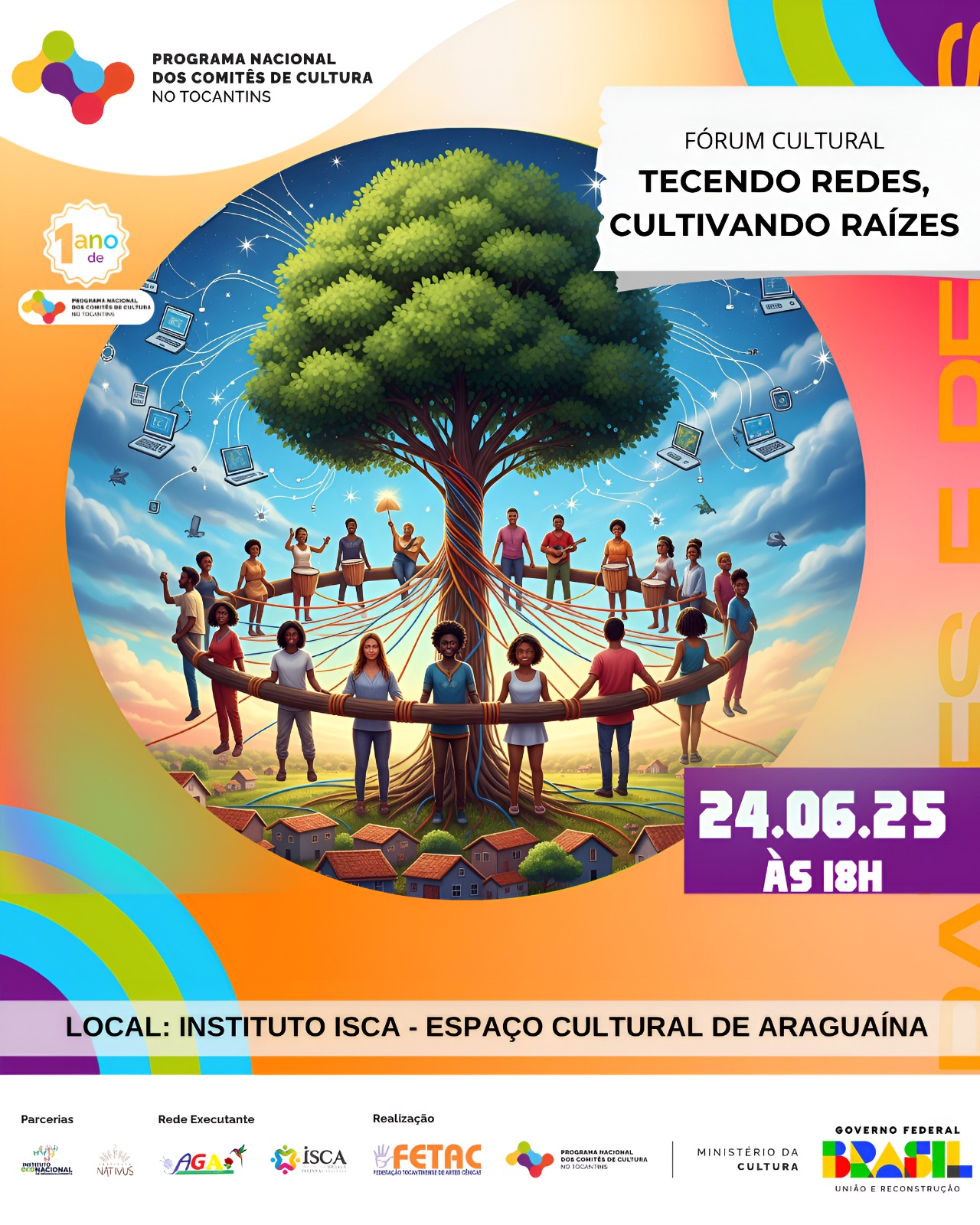 Com o objetivo de fortalecer redes culturais e promover o diálogo entre agentes culturais, estudantes e comunidades tradicionais, o Comitê de Cultura no Tocantins, com articulação da Federação Tocantinense de Artes Cênicas (FETAC), e o Instituto Isca realiza o Fórum Cultural “Tecendo Redes, Cultivando Raízes”, no dia 24 de junho, em Araguaína. A programação inclui palestra, painel temático e oficina formativa, com ênfase nas políticas públicas voltadas aos povos de terreiro e nas estratégias de comunicação para organizações culturais.