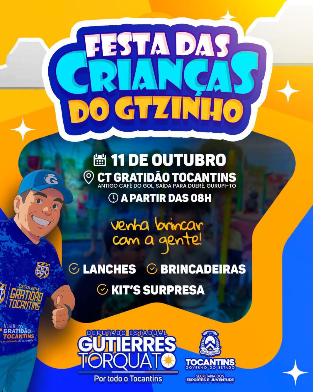 Em comemoração ao Dia das Crianças, o deputado estadual Gutierres Torquato realiza, no dia 11 de outubro, a Festa das Crianças do GTzinho, em Gurupi. O evento acontece a partir das 8h da manhã, no CT Gratidão Tocantins (antigo Café do Gol, saída para Dueré), e promete muita diversão para a garotada e suas famílias.