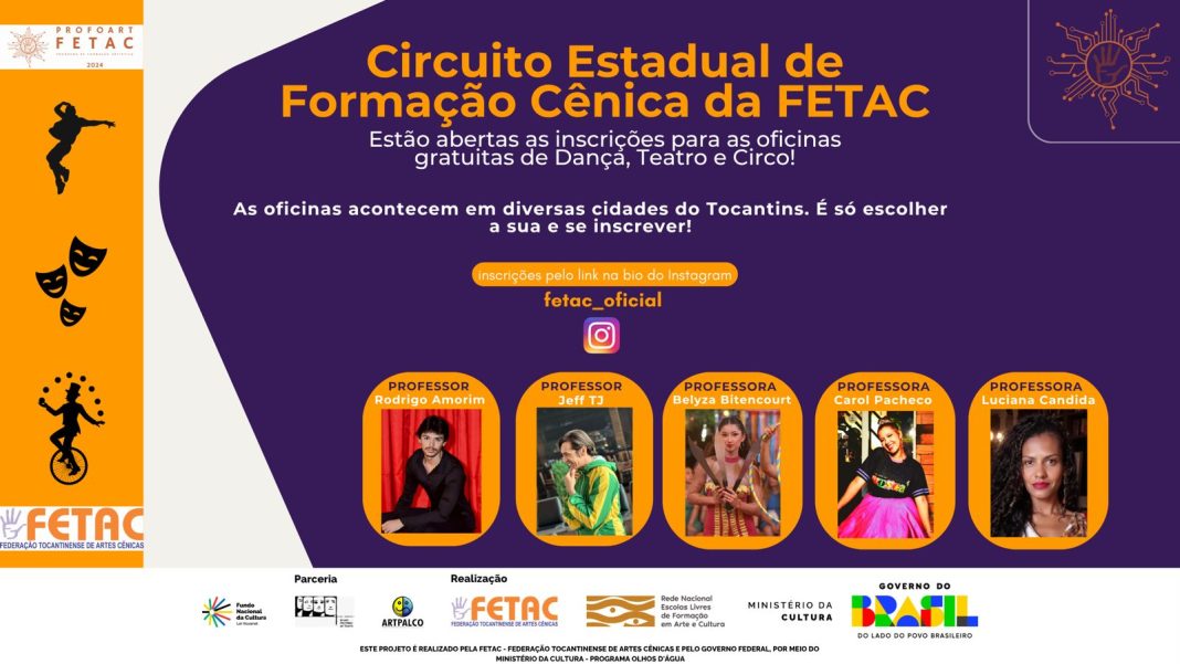 A Federação Tocantinense de Artes Cênicas (Fetac) está com inscrições abertas para o Circuito Estadual de Formação Cênica, que acontece neste mês de novembro em diferentes cidades do Tocantins, oferecendo oficinas gratuitas de Teatro, Dança e Circo para maiores de 16 anos. As atividades integram o Programa de Formação Artística – Profoart Fetac 2024, com realização da Fetac e apoio do Ministério da Cultura, por meio do Programa Olhos D’Água.