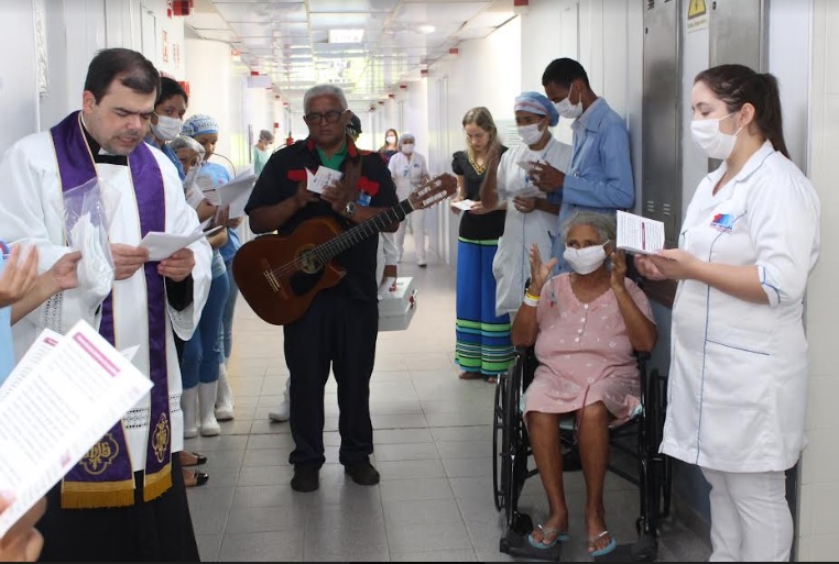 “É um momento para rezarmos pelos doentes e também pelos profissionais de saúde, pedindo que Deus abençoe aqueles que se doam para cuidar do outro que precisa”, destacou. Durante o momento de bênção, foram distribuídos frascos com água benta, para que pacientes e colaboradores pudessem levar para casa e fazer ali também um seu momento de oração.