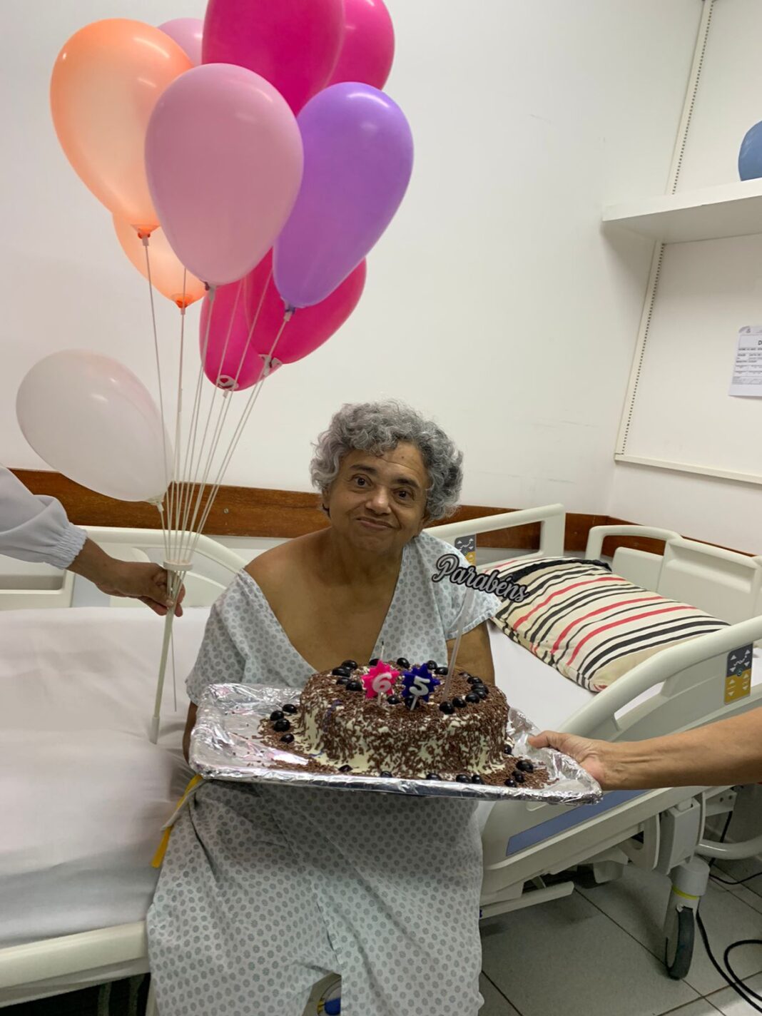 Governo do Tocantins Com o objetivo de tornar mais leve o ambiente hospitalar e levar alegria a quem já passou por vários momentos difíceis e tem que passar o aniversário internado, a equipe multiprofissional do Hospital Regional de Gurupi (HRG), comemorou, no último dia 24, o aniversário de 65 anos da paciente Doracy Lopes.A ação foi iniciativa da equipe da assistência da clínica médica, em parceria com setores de Psicologia e Humanização,  que  presentearam a aniversariante com um bolo, para festejar a data. O mimo foi feito, seguindo orientações da equipe da Nutrição do HRG, obedecendo a dieta alimentar da paciente.Os familiares foram convidados  para  cantarem parabéns. “É muito gratificante ver ela viver um momento como esse, o maior sonho dela era ganhar uma festa de aniversário e vocês do hospital fizeram isso por ela,  só tenho que agradecer a todos. É uma iniciativa muito boa, pois alegra o coração de todos nós”, afirmou Maria Divina, irmã  da paciente.