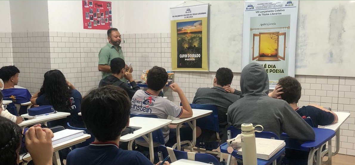 No último dia 18, o Colégio Albert Einstein, em Palmas, recebeu a visita ilustre do poeta e professor André Goveia, que foi a atração especial do sarau literário “Vozes do Cerrado: Cantos, Contos e Encantos do Tocantins”. Na oportunidade, Goveia participou de uma roda de conversa literária, onde falou um pouco da sua trajetória cultural e destacou a importância da leitura na formação intelectual dos alunos.