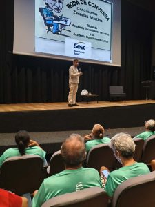 Titular da Academia Tocantinense de Letras (ATL) e da Academia Gurupiense de Letras (AGL), o escritor, poeta,  jornalista e produtor cultural Zacarias Martins participou de uma movimentada  Roda de Conversa  Literária na manhã  de quarta-feira, 05, no  Cine Teatro do Sesc, em Gurupi, e que teve como público-alvo, os participantes do Grupo Vida Ativa, iniciativa do Sesc que colabora no resgate social da pessoa idosa promovendo socialização, autonomia e o exercício da cidadania.